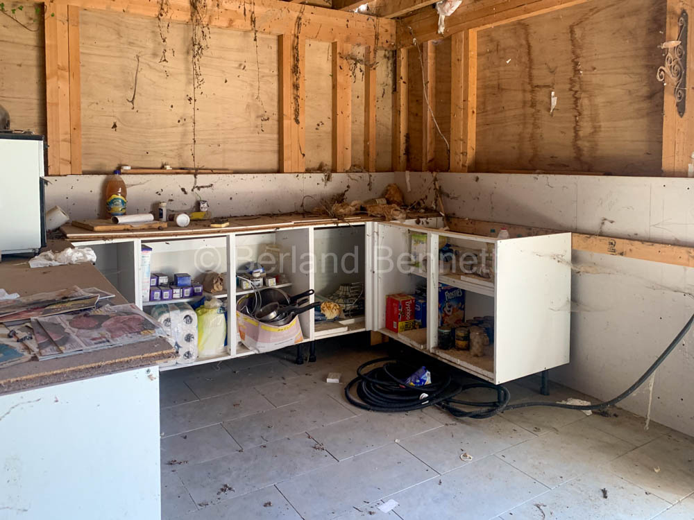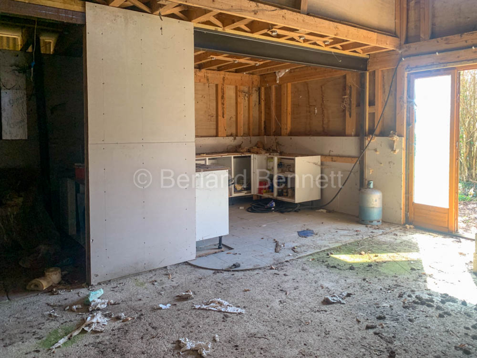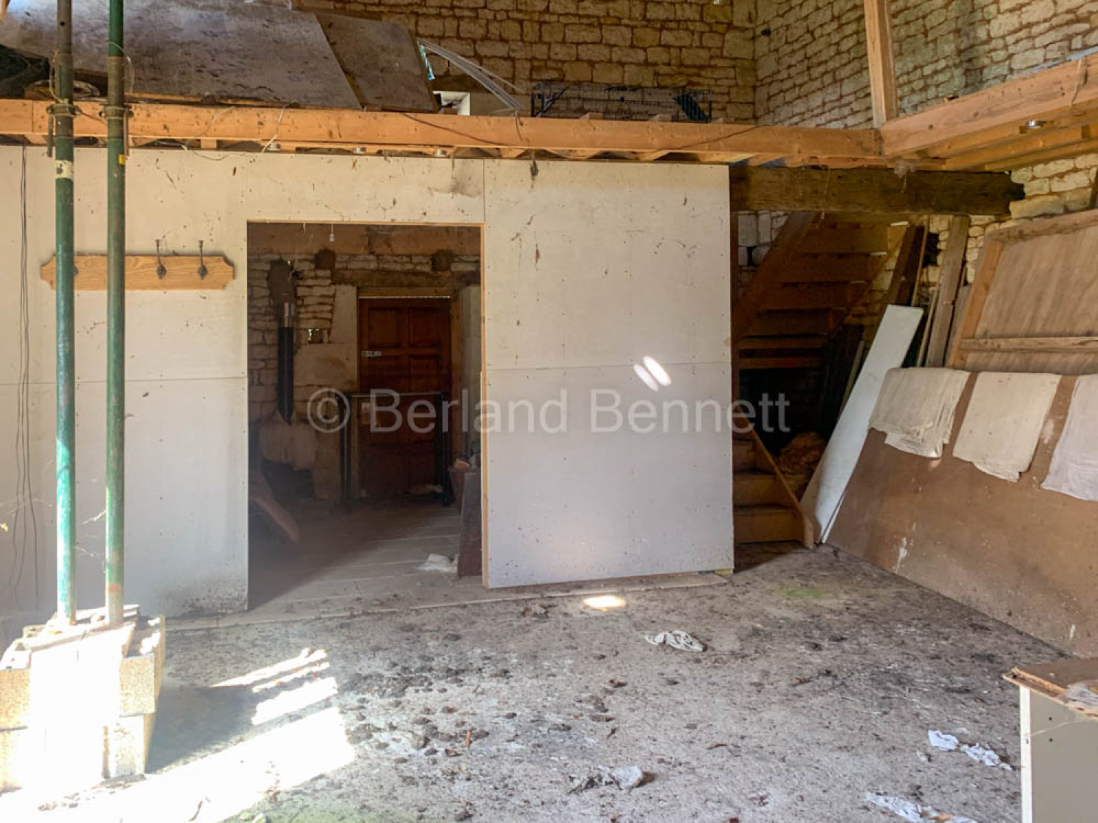Au rez de chaussée : pièce avec coin cuisine, escalier en place, coin salon et emplacement prévue pour une salle de bain
