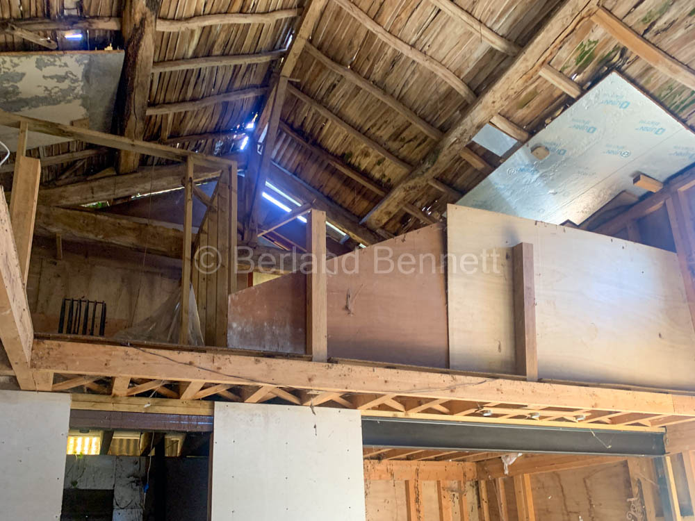A l’étage : deux mezzanines en cours d’installation permettant la création de deux chambres, de chaque côté.